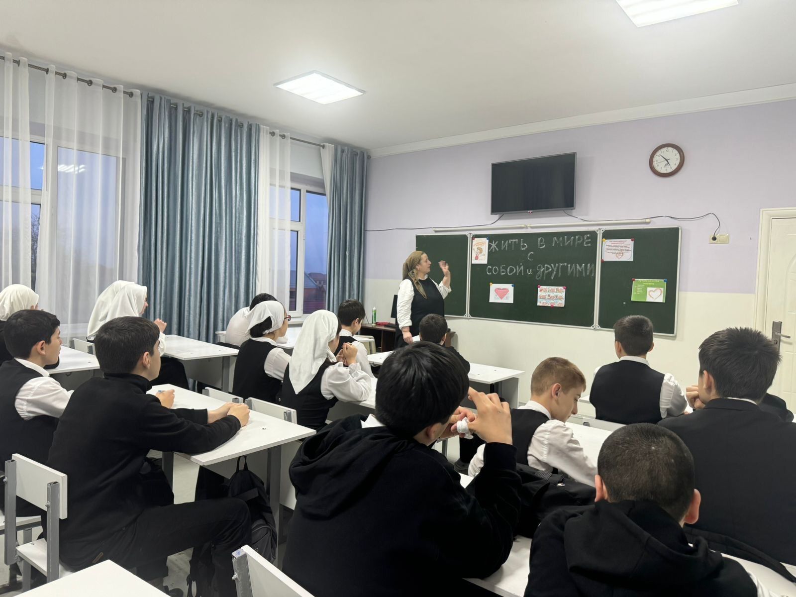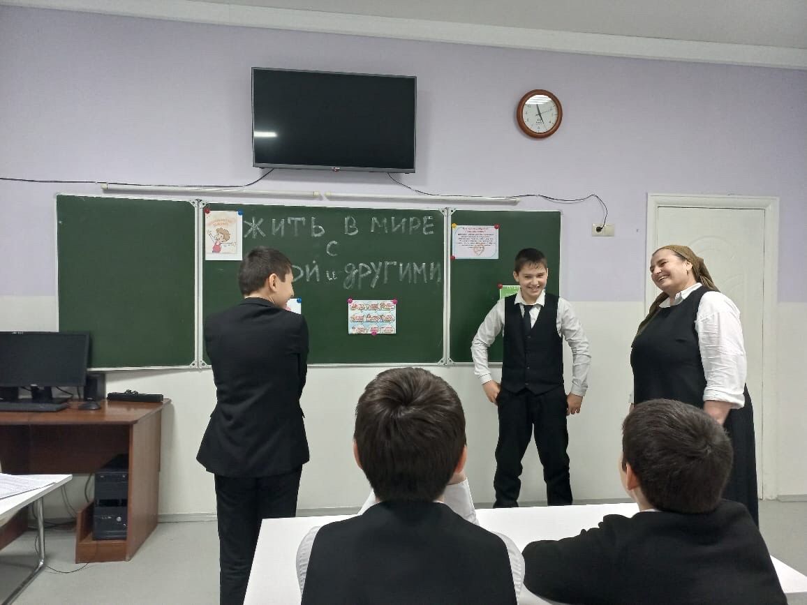 29.01.2025В МБОУ "СОШ 6 г.Урус-Мартан", педагог-психолог провела с обучающимися классный час на тему: "Жить в мире с собой и с другими". Целью проведения данного классного часа являлась оказание помощи учащимся в осознании важности внутреннего мира и гармонии в отношениях с окружающими, развитии навыков эмпатии и сотрудничества, что поможет учащимся лучше понять себя.